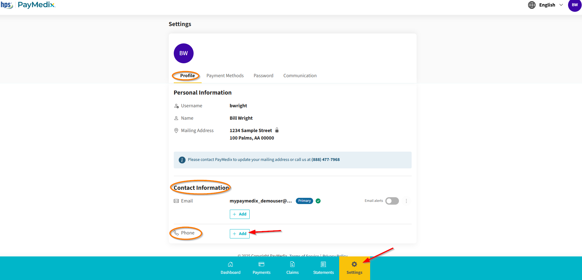 - Within the Profile tab, under the "Contact Information" section, click on the "+ Add" next to "Phone".