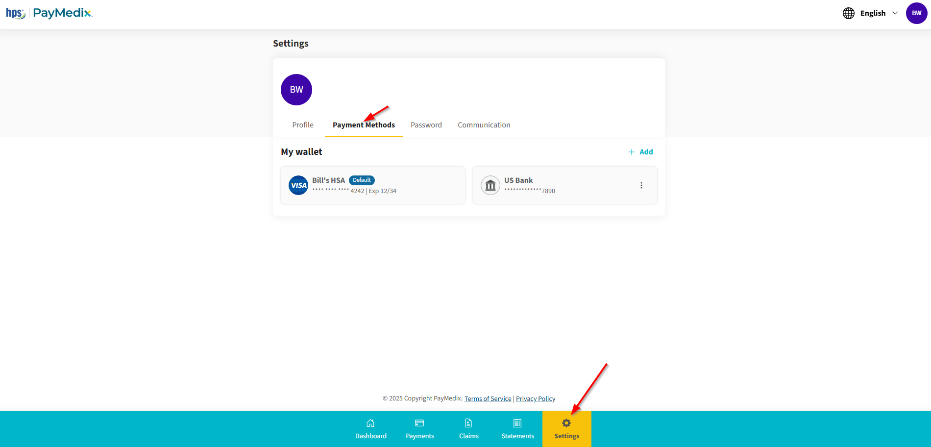 - Click on the "Settings" tab on the navigation bar at he bottom of the screen and then click on the "Payment Methods" tab.