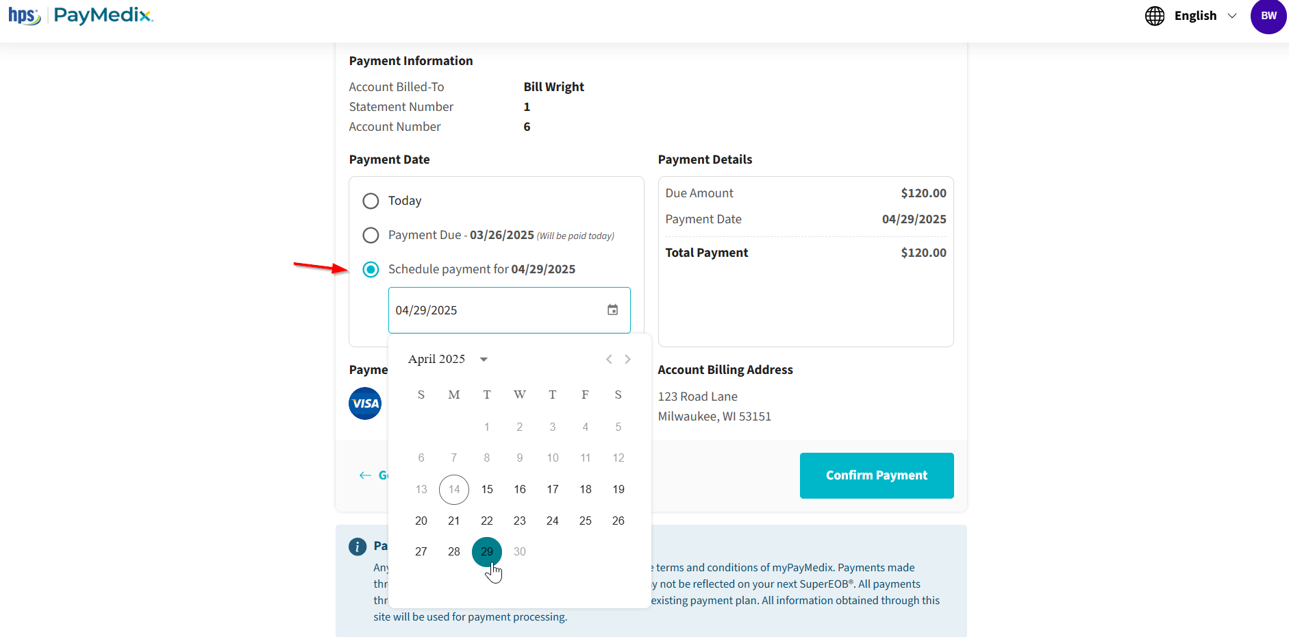 To schedule a payment, select "Schedule payment for" radio button to select a date on the payment date calendar located on the "Make a Payment" screen.