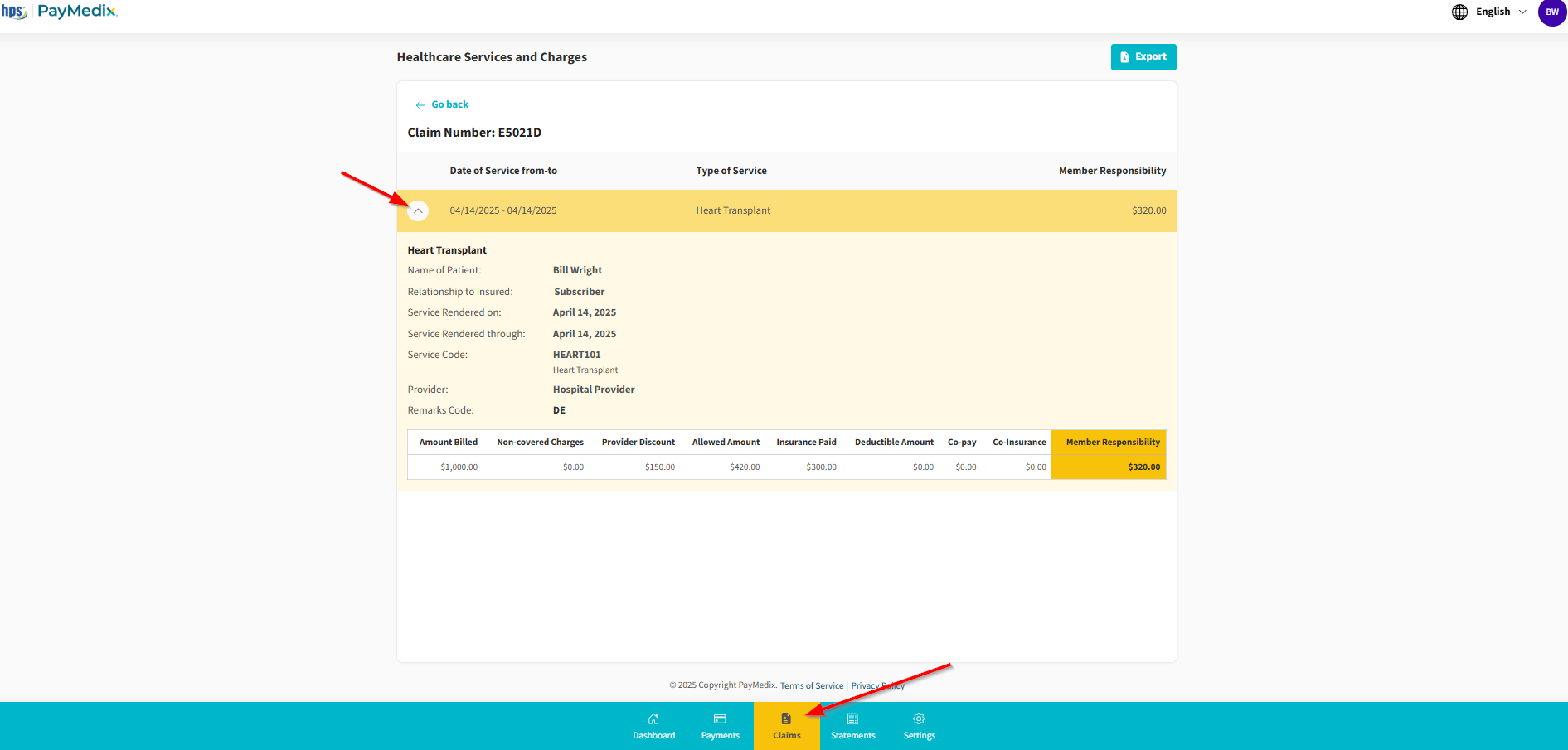 How do I view more details about my claims? HPS Customer Care April 15, 2025 01:10 Updated Log into your myPayMedix account. Click on Claims in the navigation bar at the bottom of the screen. Select the claim in which you would like to have more information on and click on the down arrow to expand the details. Related articles What information will I need to register online? Why should I register for an account? How do I register? Where can I find my balance with HPS | PayMedix? I forgot my username. Powered by Zendesk